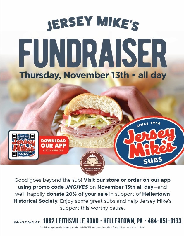 Announcing another Dine-to-Donate opportunity to help raise needed funding for Hellertown-Lower Saucon Heritage Day. This time we have made arrangements with Jersey Mikes Subs at the Creekside/Giant shopping center at 1862 Leithsville Road, Hellertown, PA 18055. Order your sandwiches in the store or on the Jersey Mikes app, enter the special code “JMGIVES” and 20% of the proceeds are donated to Hellertown Historical Society. If you scan the QR Code on the attached image, you can download the Jersey Mikes app and start your order as well as starting to earn rewards toward future purchases. This opportunity is available only at the 1862 Leithsville Road store all day Thursday November 13 from 10AM-9PM — BE SURE TO ENTER THE SPECIAL CODE OR NO DONATION WILL OCCUR!! As with all our fundraisers, we graciously appreciate and thank you for your support of our organization.